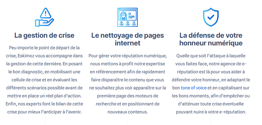 « Faire face aux menaces avant qu’elles ne vous dépassent est nécessaire. La gestion de votre notoriété web est un travail indispensable qui permet de faire rayonner votre marque sur la toile en nettoyant votre e-réputation de toutes actions malveillantes. »
